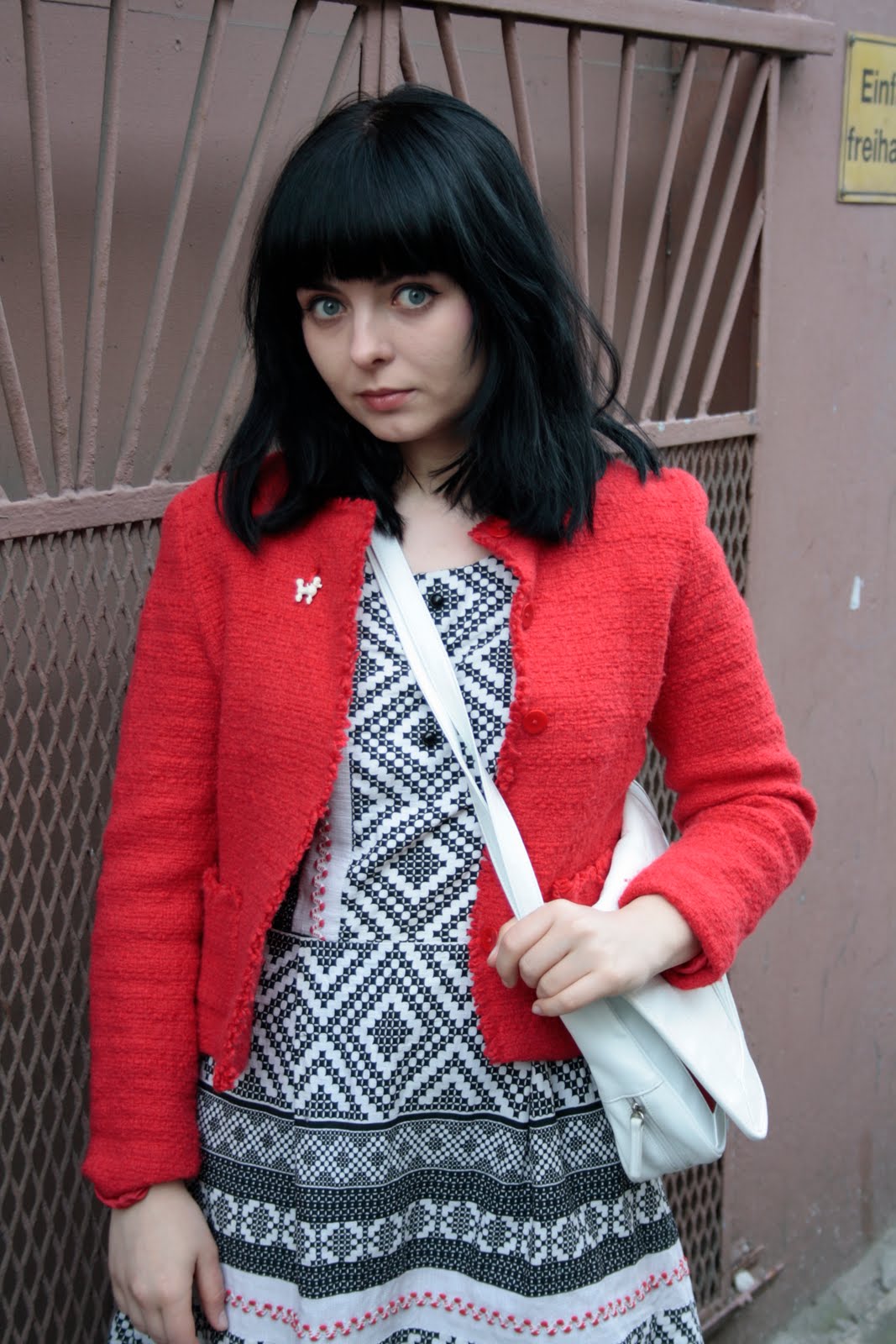 costume consists of dress with lace collar, blazer striped, and interesting in my humble opinion, accessories, brooches with a pair of Crossroads emotions mokasynko similar retro shoes and handbags snap:)